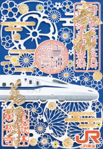 颯爽と走る新幹線「N700S」のまわりには金の箔押しで彩り、万松寺の家紋である織田瓜紋と葵紋とともにかわいらしい花々をあしらった上品で華やかな切り絵御朱印(記念書)です。