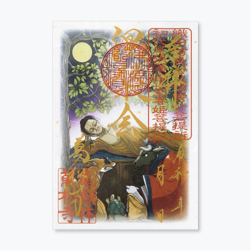 お釈迦様が涅槃に入られた際、仏弟子や動物たちが集い、深い哀しみの中で別れを偲ぶ情景を描いた御朱印です。